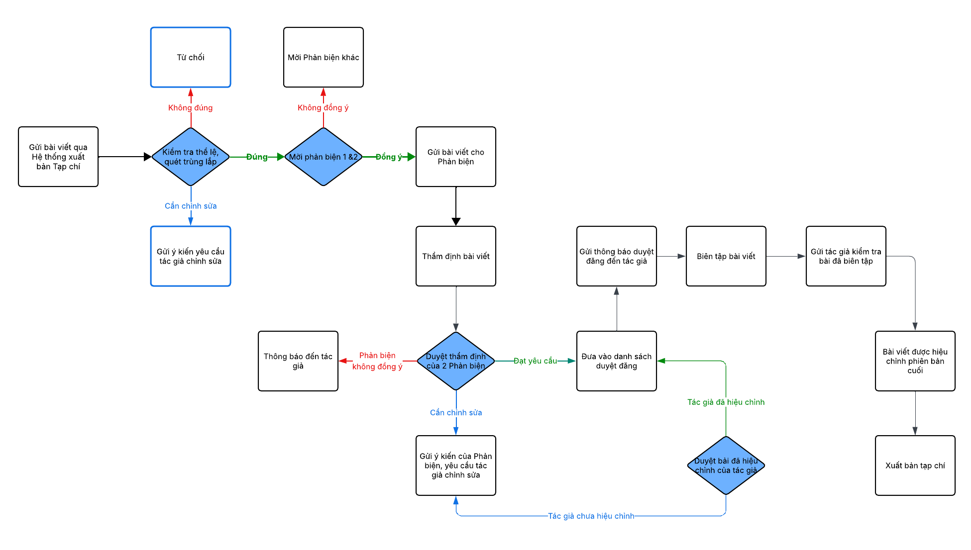 - Quy trình xuất bản: Tất cả bản thảo đều được gửi, sơ duyệt, phản biện, biên tập và duyệt đăng qua hệ thống trực tuyến của Tạp chí nhằm đảm bảo tính công khai và minh bạch cho mọi bên liên quan. Hội đồng biên tập chịu trách nhiệm quyết định chấp nhận đăng bài dựa trên việc tham khảo ý kiến chuyên môn từ phản biện viên. Đánh giá dựa trên chất lượng nội dung và giá trị khoa học của bài viết.